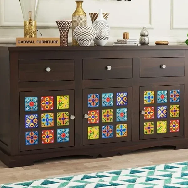 Boho Sheesham Wood Tv Cabinet with Ceramic Tiles & Storage