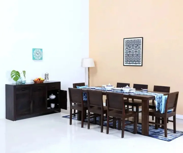 Made of high-quality Sheesham wood, this 6 seater Dining Table Set is sturdy in nature and offers lasting durability. You can choose from a range of variant finishes when purchasing the Acro 8 seater dining table set.