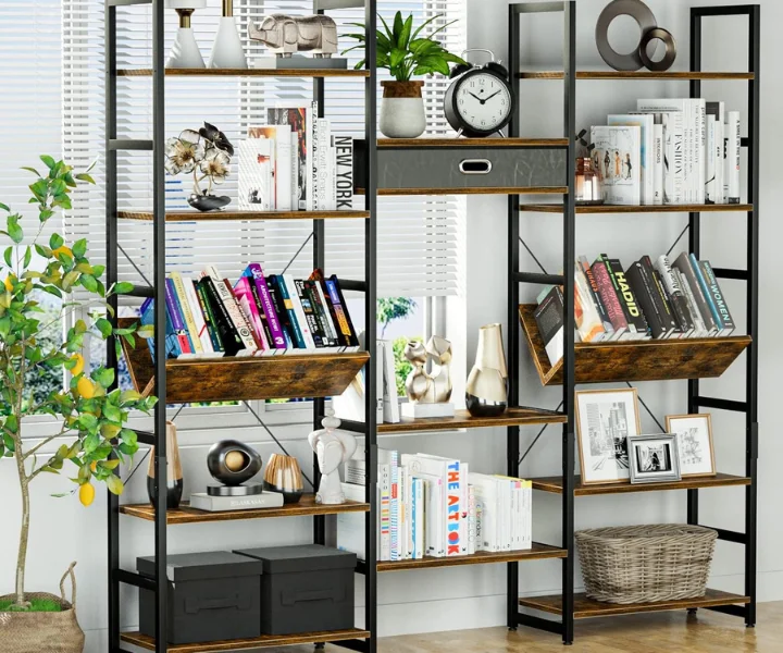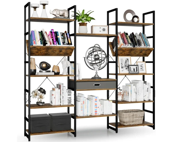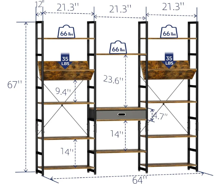 Constructed by premium metal and selected particleboard, the contemporary style bookcase is solid, stable, sturdy, and durable; With top-notch anti-rust coating, the whole shelf looks more sophisticated; With an excellent metal frame and thick solid panel, each normal shelves can hold up to 66 lbs and the V-shaped shelves can hold up to 35 lbs; Because of the fixed rod assembly, the industrial shelf has strong stability and can perfectly protect you