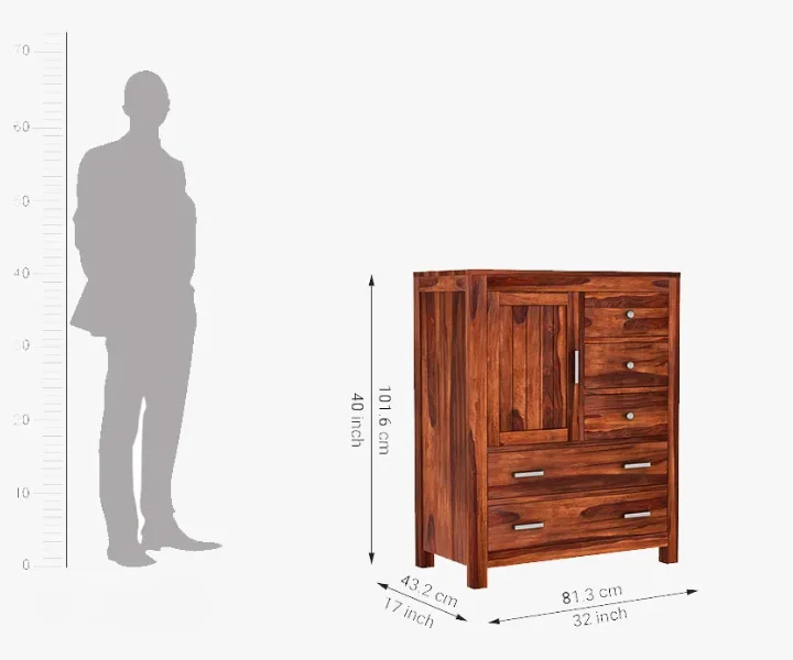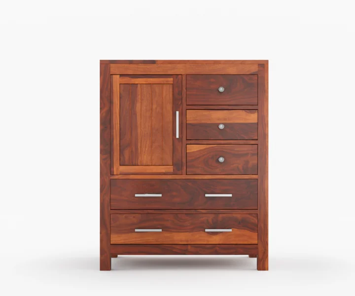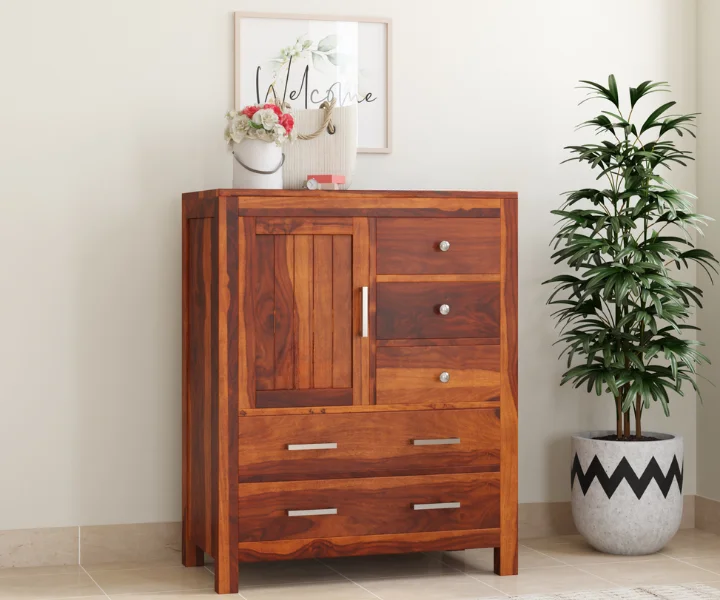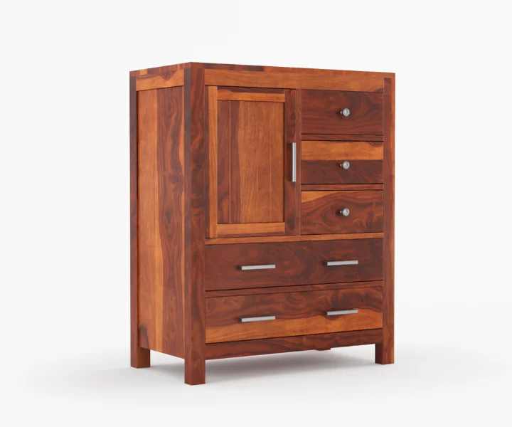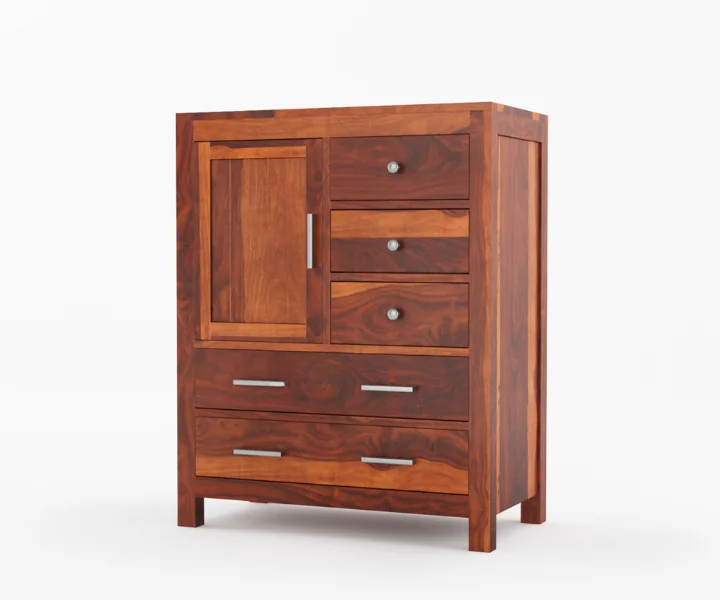 Product Features: The Alvon Sheesham Wood Chest of Drawers in a warm honey finish combines timeless design with practical storage solutions. Featuring five spacious drawers and a single door, this solid wood dresser offers ample room to organize clothes, accessories, and essentials neatly. Its elegant yet sturdy frame makes it a versatile addition to any bedroom, providing both style and functionality. Delivered pre-assembled, the chest is ready to elevate your home storage immediately.