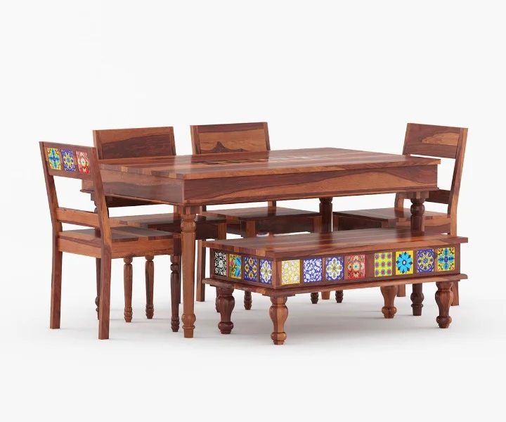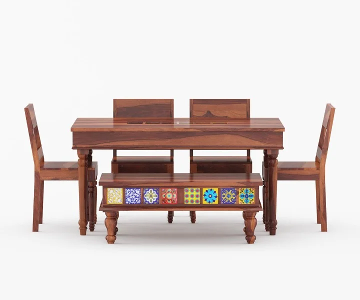 Made of high-quality Sheesham wood, this 6 Seater Dining Set is sturdy in nature and offers lasting durability. You can choose from a range of variant finishes when purchasing the Alyssa 6 Seater Dining Table Set with a bench.