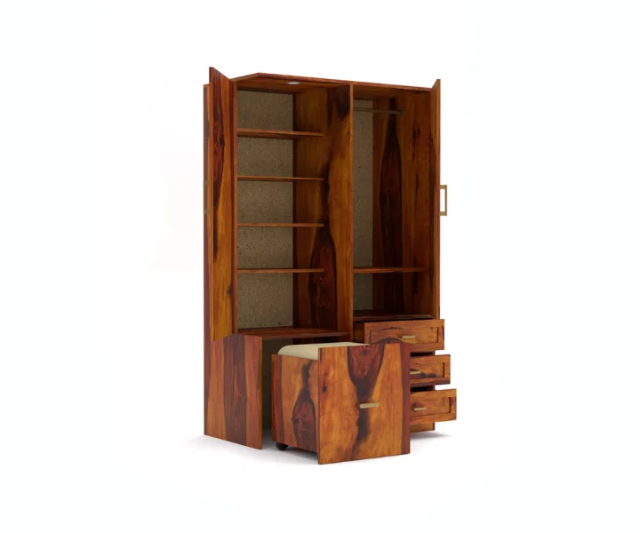 1. A matt metallic look with wood can be seen in dressing unit. Amaze It has overlapped wooden strips forming a traingle on it bottom cabinet.