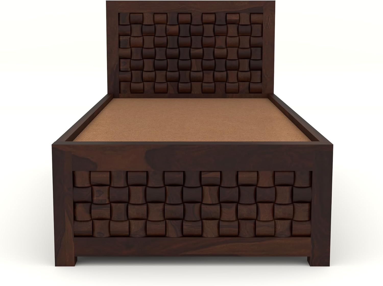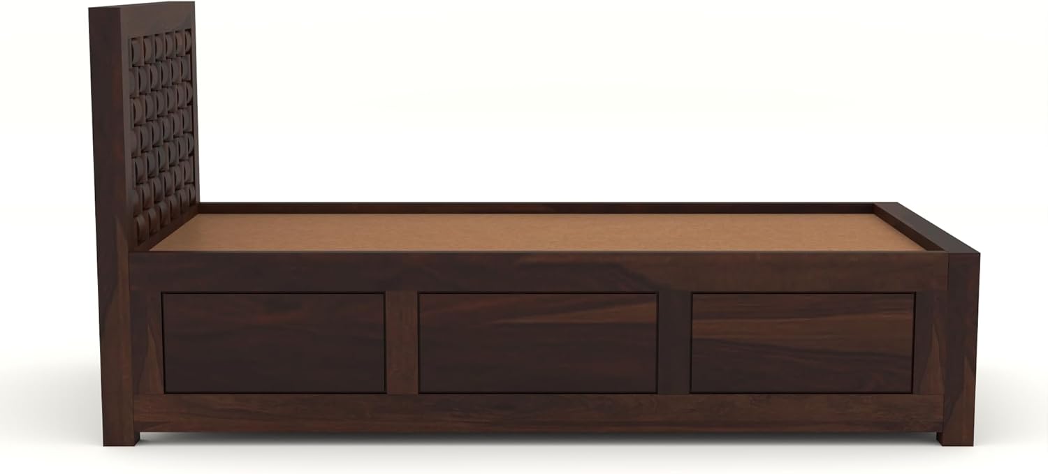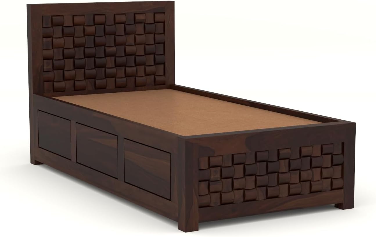 The Balikos Single Bed is crafted from premium Sheesham wood and finished in a rich teak tone, combining durability with everyday functionality. Designed for modern bedrooms, it features integrated drawer storage that helps keep essentials neatly organized while maintaining a clean, timeless wooden aesthetic.