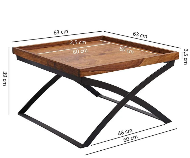 Bastia living room table in the trendy industrial style. The two crossed legs not only ensure a secure stance, they also look very appealing! Snacks, remote controls, magazines and the like can be found on the square solid wood table top. Lean back and enjoy your TV program while the coffee table has everything you need close at hand!