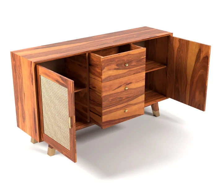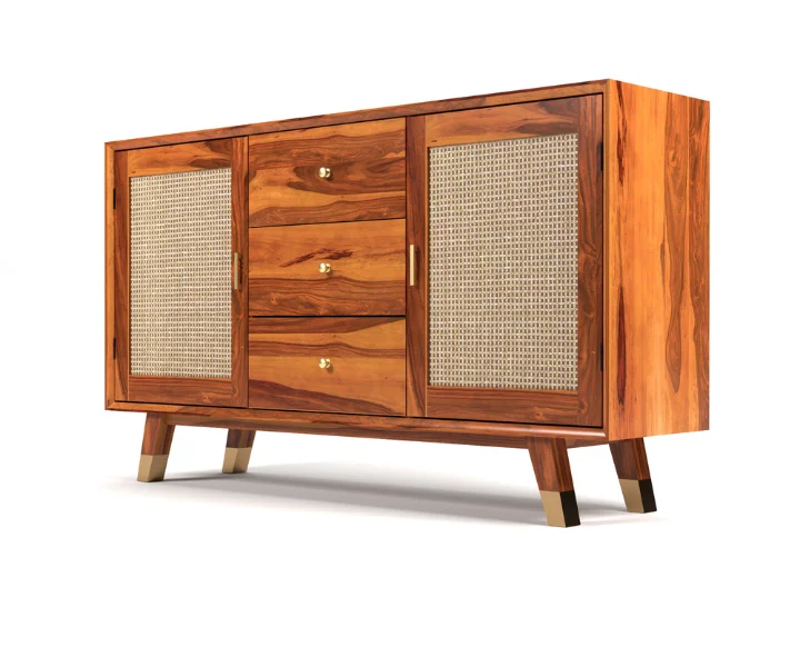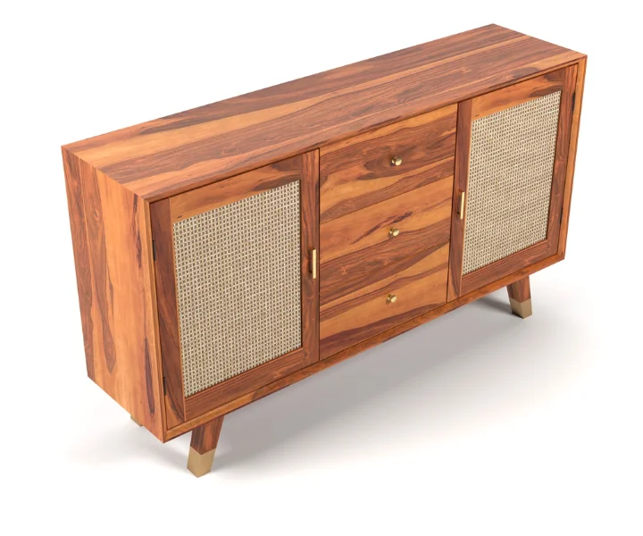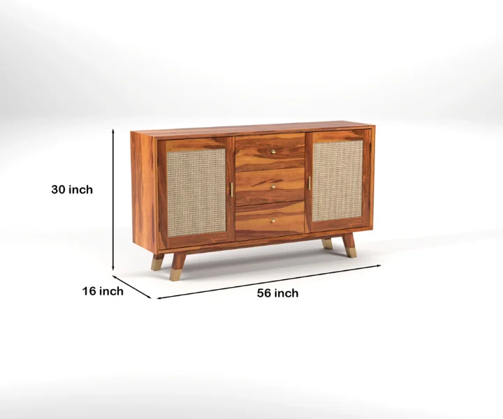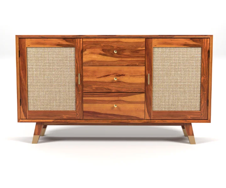 Product Features: The Iriana cane cabinets and sideboards showcase a perfect blend between traditional and modern aesthetics. Designed to be both stylish and functional, it offers ample storage space with three spacious storage drawers and two side cabinets. The cane work on the cabinet adds a retro-inspired aesthetic to the room while enhancing the visual interest of your space. It creates a warm and welcoming atmosphere, making it ideal for living areas.