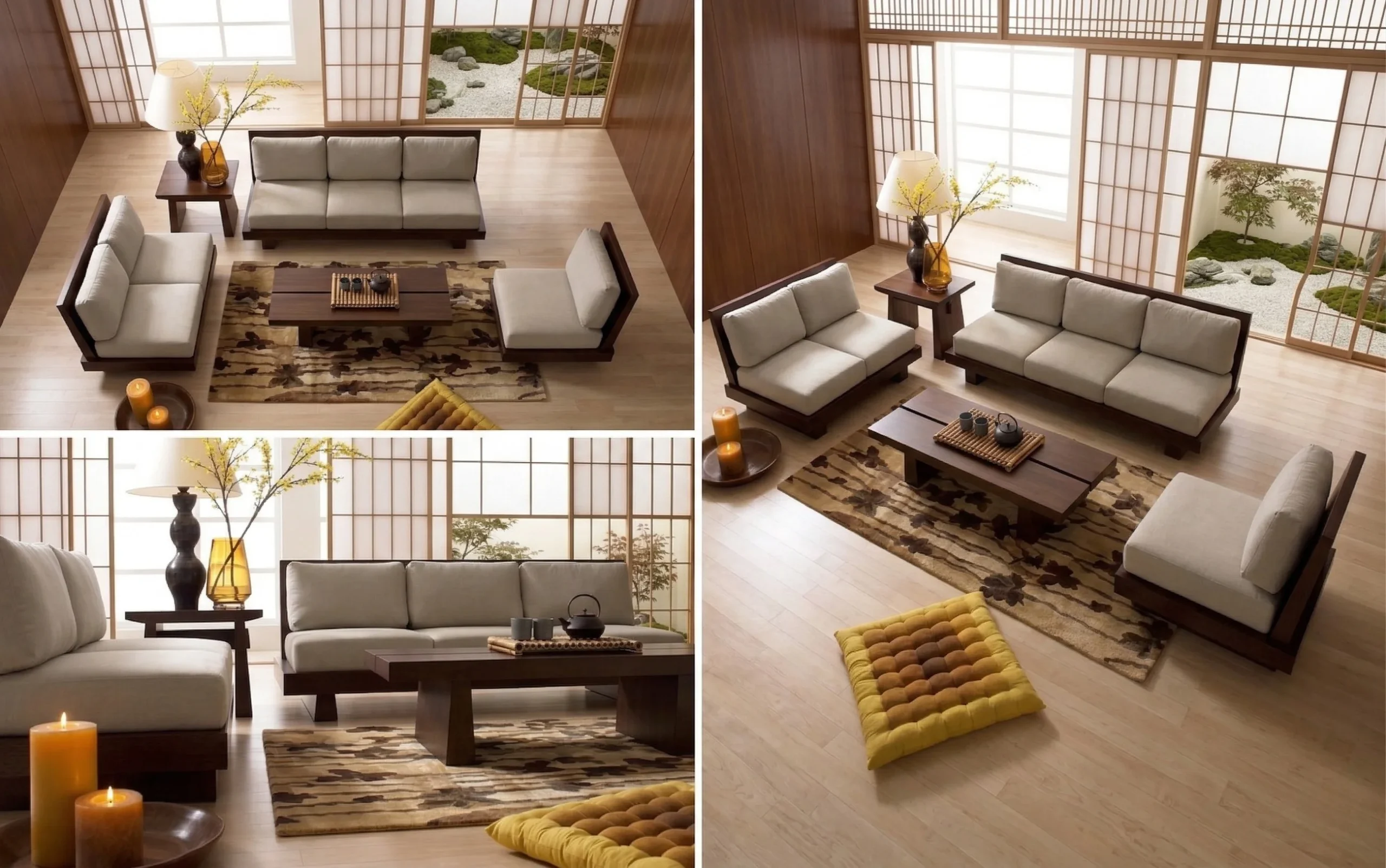 - Low-profile seating (Japanese/Zen-inspired look)Neutral color palette (wood + beige cushions)