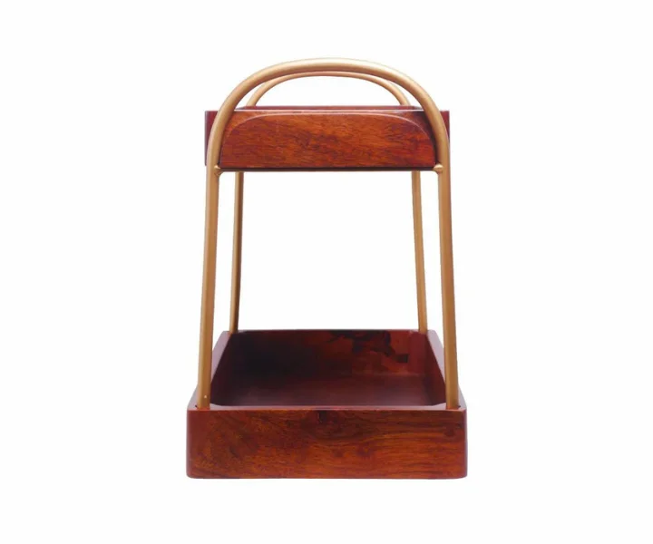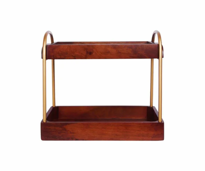 The dual-tier design is a visual masterpiece, seamlessly blending elegance with utility. The robust metal frames complement the natural grain of the wood, creating a timeless piece that enhances the visual appeal of any space.