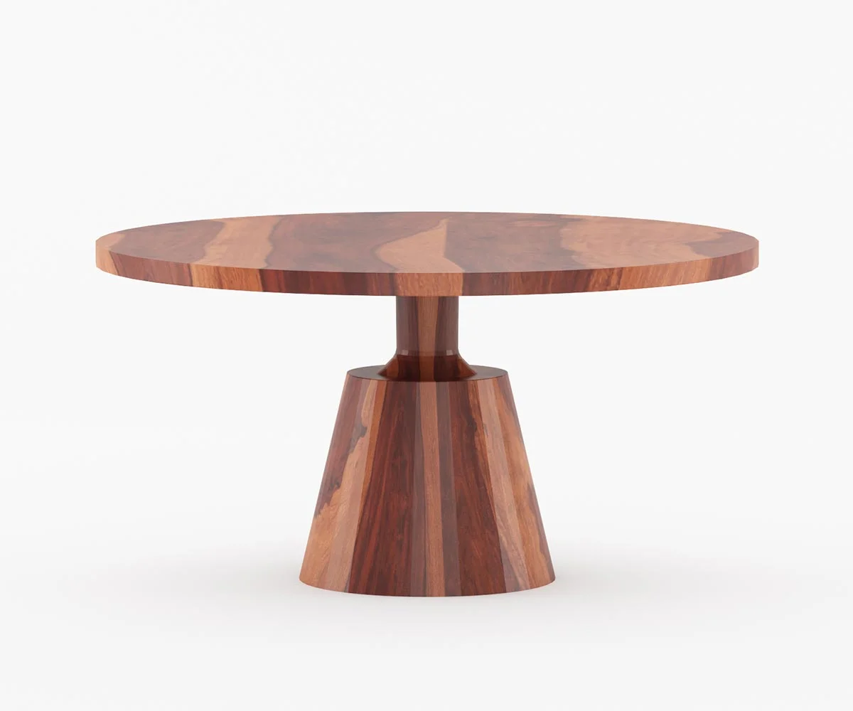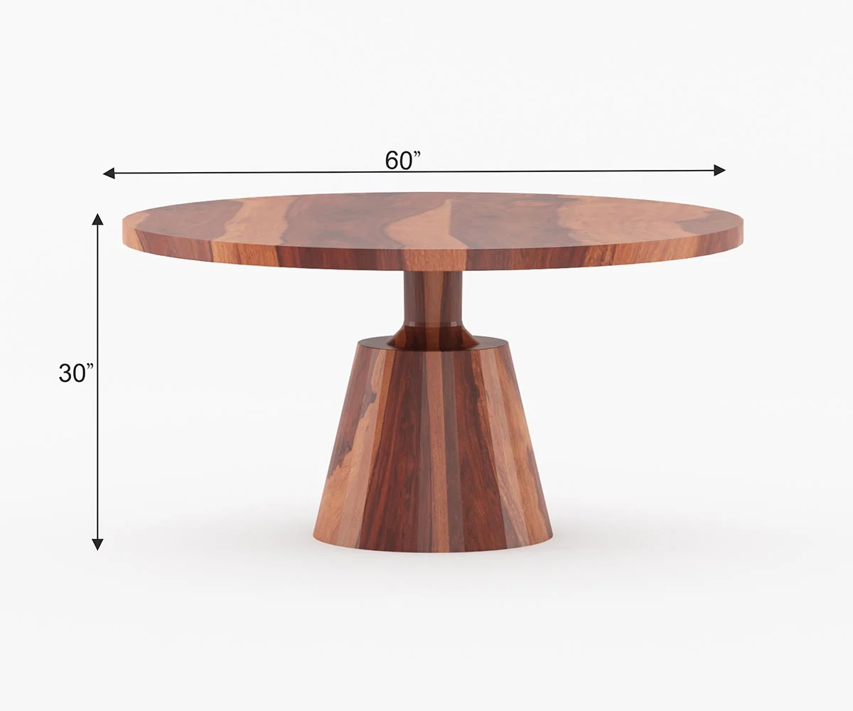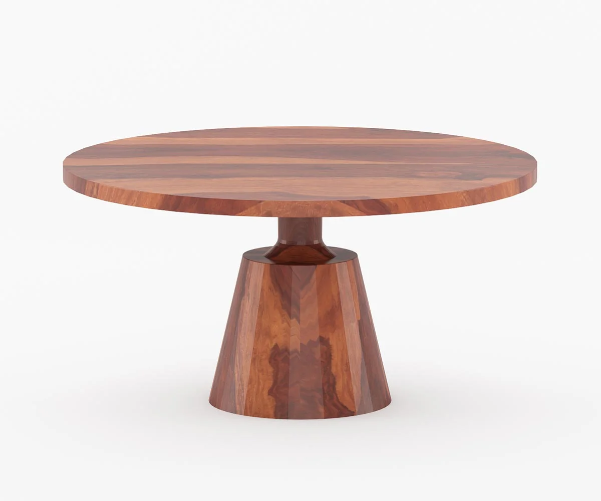 The dining table is round with a wooden base and a polished honey finish. The wood appears to have a natural grain pattern, adding a warm, rustic touch.