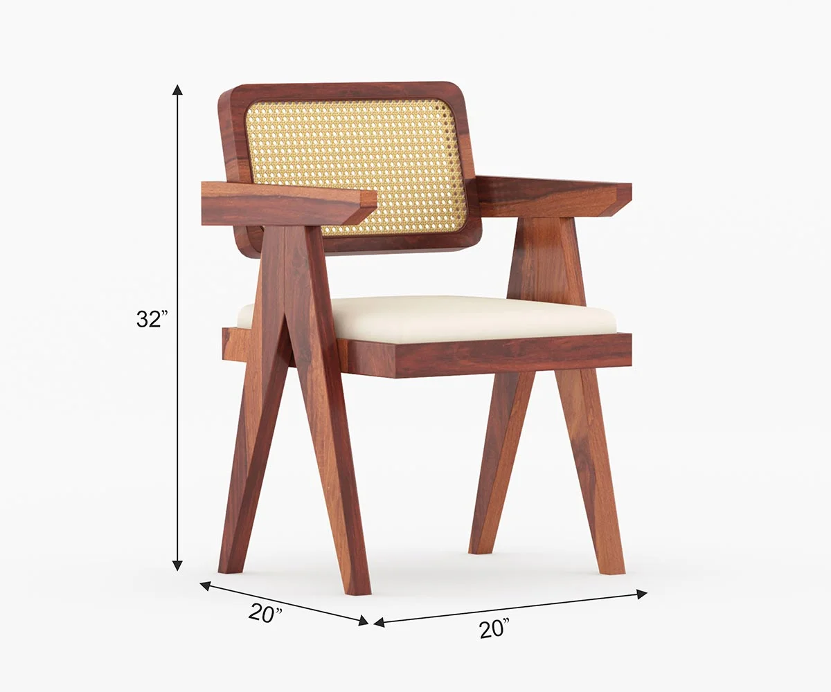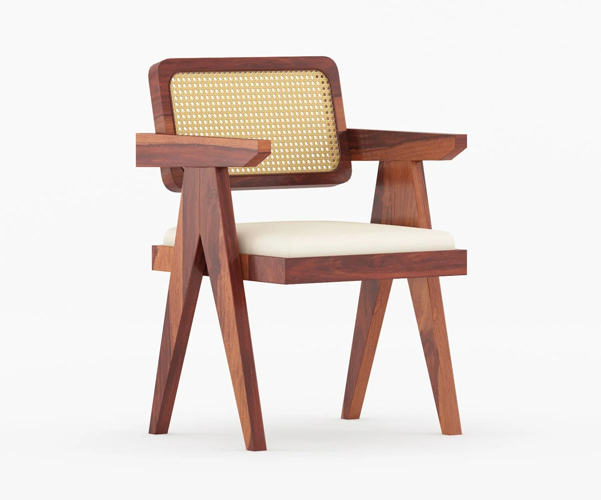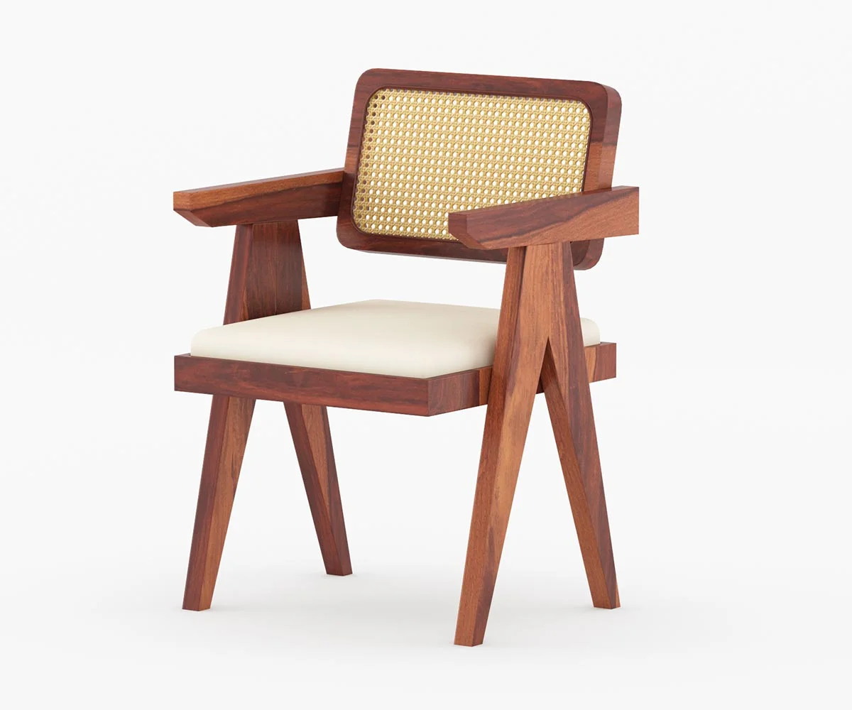 The chairs are made from the same wood, with unique angular legs and armrests. The backrests are designed with a woven cane or rattan material, which adds a vintage yet trendy feel to the set. The seats are cushioned with a light-colored fabric, providing contrast and comfort.