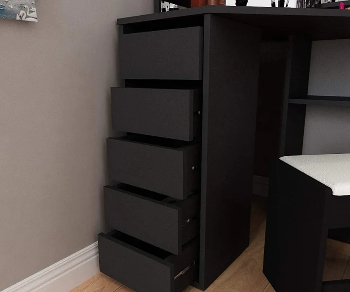 The Desk Engineered Wood Dressing Table is a stunning piece of furniture designed to enhance the aesthetics of any bedroom. Made with premium quality engineered wood, this dressing table is a perfect combination of style and functionality. The beautiful finish gives it a contemporary look that is sure to catch the eye. The table comes with a large mirror and ample storage space, including a cabinet and drawers, which make it an ideal place to store all your cosmetics and accessories. The cabinet has a shelf that can be adjusted to your preference, making it a versatile addition to your room. The drawers have smooth sliders and provide ample storage space for all your essentials.