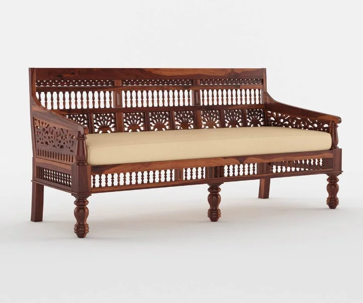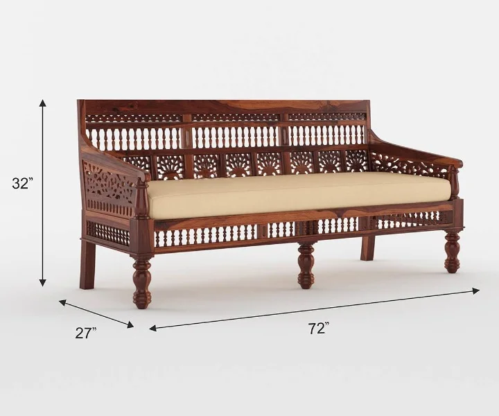 The sturdy and durable construction ensures long-term use, while the comfortable cushions provide ultimate relaxation and comfort. The wooden frame has intricately carved details, showcasing the finest craftsmanship of Gadwal Furniture.