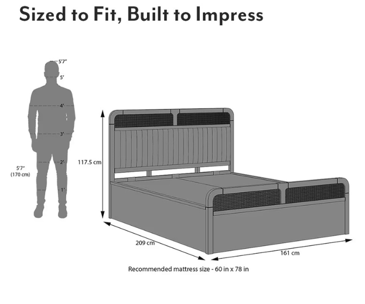 Framed in solid Sheesham wood, Hanoi’s silhouette strikes the perfect balance between refinement and warmth. The cane webbing panels on the headboard and footboard introduce an artisanal touch, while a plush, vertically pleated upholstered section at the headboard offers a cocoon of comfort. The result? A bed that’s as soothing to the senses as it is stunning to behold.