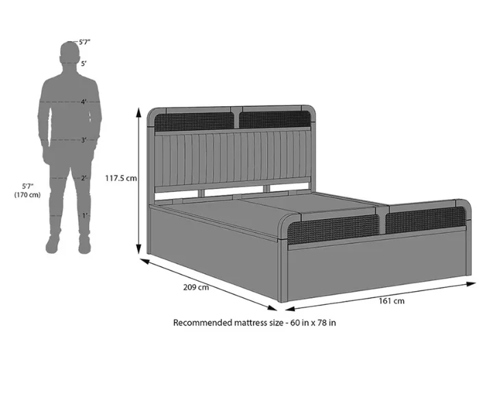 – Recommended mattress size for king is 78 x 72 inches; queen is 78 x 60 inches.