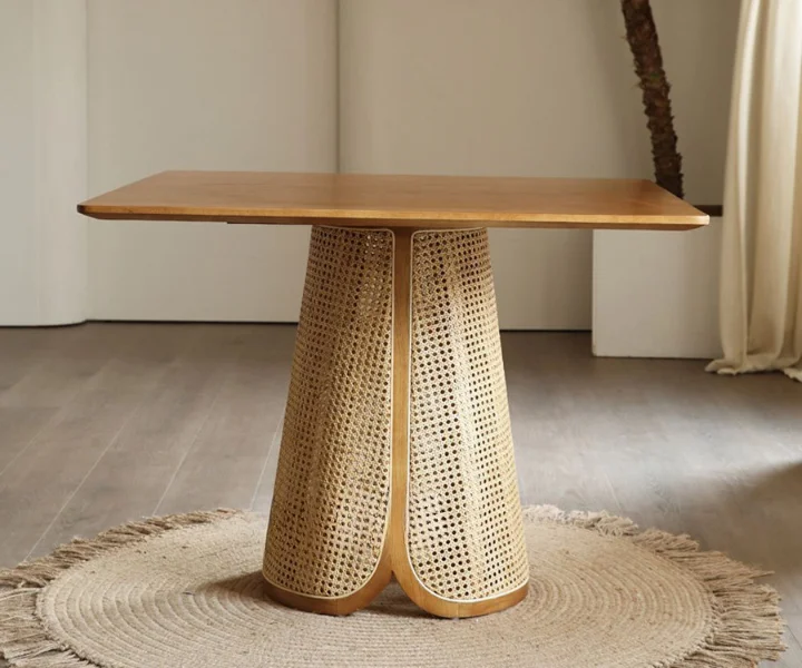The table stand, also adorned with rattan cane, creates a striking contrast with the teak wood, blending natural elements into a warm, inviting design. This combination not only adds visual interest but also introduces a unique character to your dining area.