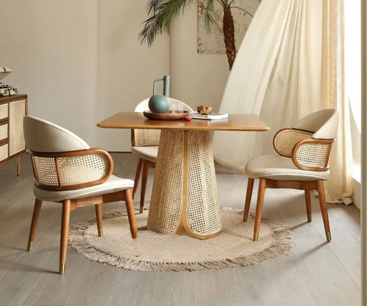 Each chair is adorned with a beautifully woven rattan cane backrest, offering both visual appeal and comfortable support. The subtle flexibility of the rattan cane provides a gentle, relaxing sway, enhancing your overall dining experience.