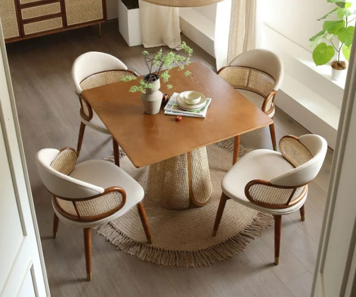 Elevate your dining experience with our exquisite dining table set, where sophistication meets comfort and natural beauty. Available in both round and square designs, this set includes a meticulously crafted table and four chairs, perfect for intimate gatherings or family meals.