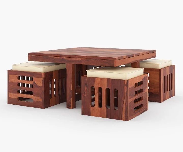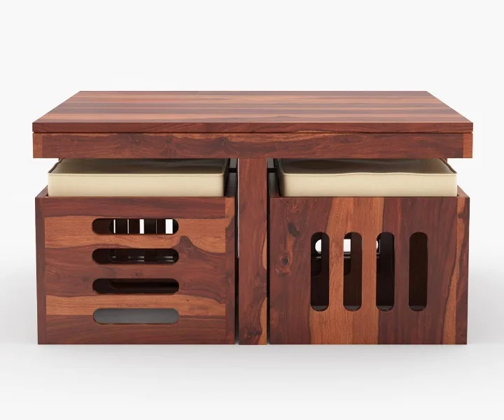 This coffee table is a perfect example of space-savvy design. It consists of comfortable stools which can be placed underneath the tabletop when not in use and easily be pull out. The slatted pattern on all the sides of stools makes it more appealing.