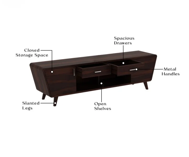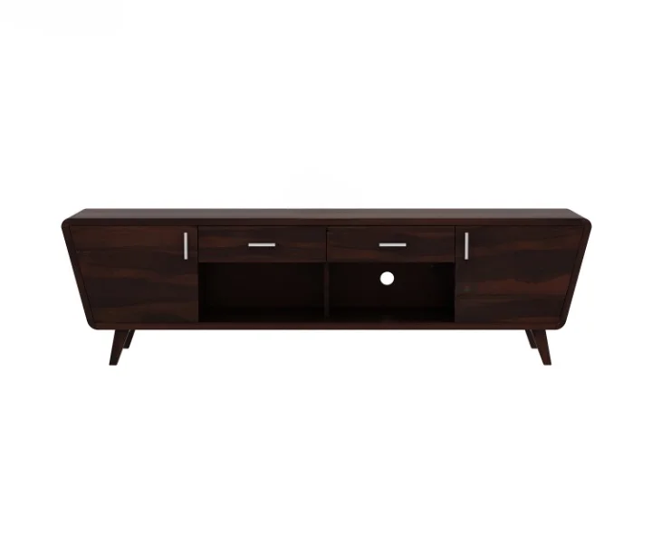 1. Melvina is a rustic TV unit design with contemporary texture upon it. This furniture unit is with slanted sides and curved edges. It has small cupboards, drawers and shelves accommodated upon it. This has tapered legs that are slantly assembled.
