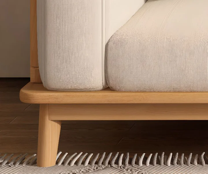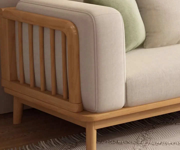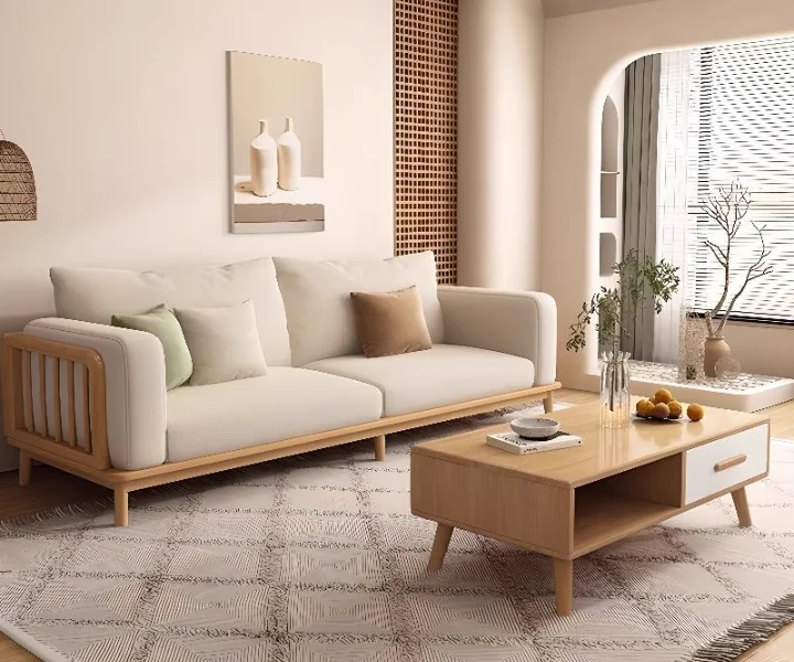 Keywords: wooden sofa set, solid wood sofa, beige cushion sofa, modern sofa set, contemporary living room furniture, minimal wooden couch, Scandinavian sofa design, ergonomic wood furniture, small space sofa set, luxury wood sofa.