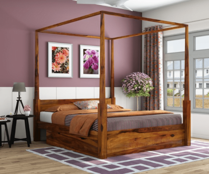 The bed in the image showcases a robust Sheesham wood frame with a rich brown finish.