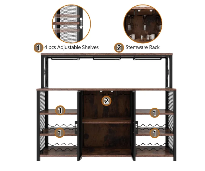 This wine bar cabinet offers ample storage to maximize your space. It gives ample storage space while keeping everything contained and out of sight. Including a cabinet that provides closed storage options with two mesh doors. Built in Stemware holder, which can store up to 9 goblets. While 4 set removable wine racks on side to display your favorite vintages. The table top is additionally attached a storage rack with built-in wine glass hanging space to provide more storage space.