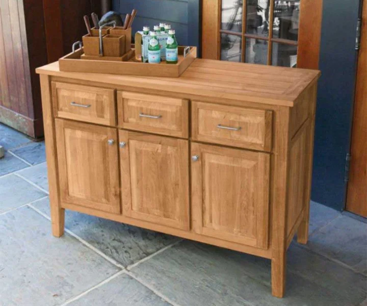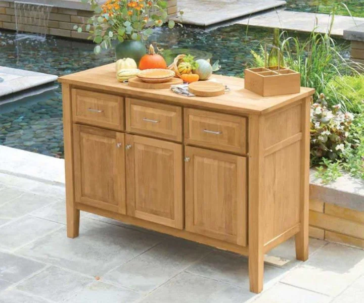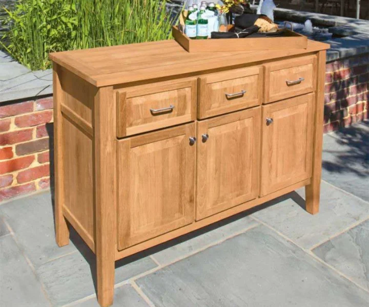 deal for outdoor entertaining, the Teak Wood Cabinet features three pull-out drawers with solid teak construction, three hinged doors, and stainless steel handles and hardware. Teak top features weather-resistant silicone to keep drawers dry.