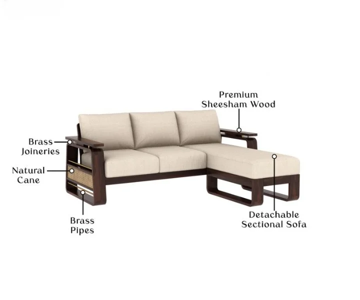 Vedic L Shape Sheesham Wood Sofa With Cane and Brass Detailing
