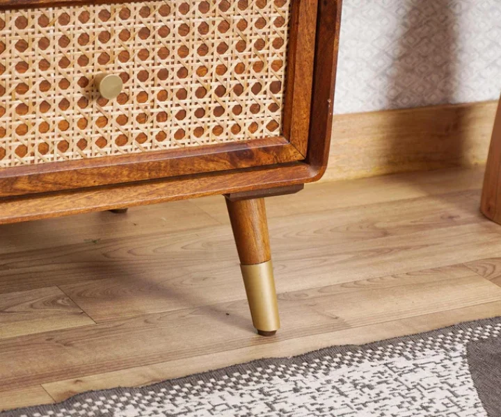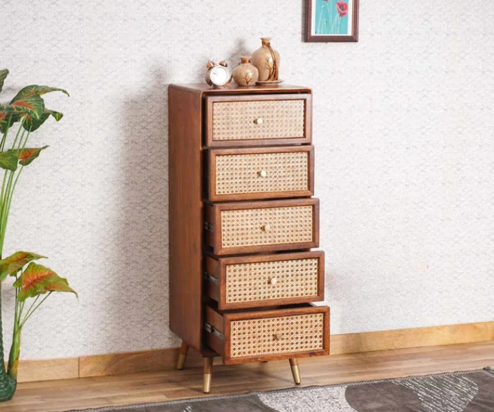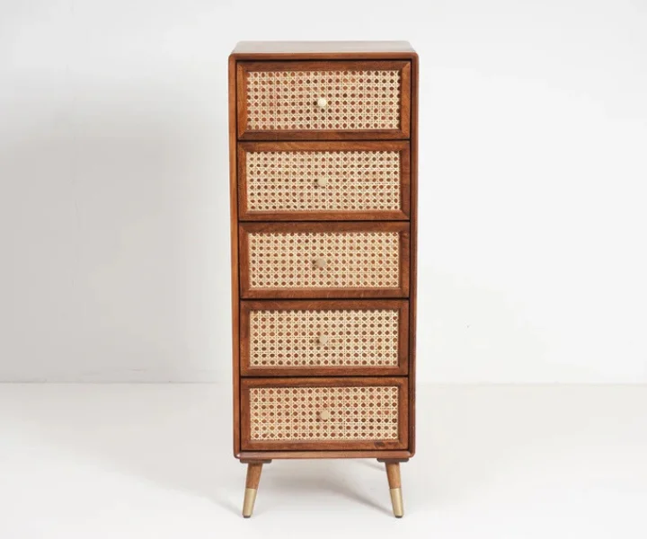 Add a touch of natural elegance to your living space with this Vintage Solid Wood Rattan Cane Tall Chest of Drawers. Expertly handcrafted from premium Sheesham wood, this vertical storage unit features five spacious drawers adorned with intricate cane rattan detailing. The warm honey finish highlights the wood’s natural grain, while the sleek tapered legs with brass tips lend a mid-century modern flair.