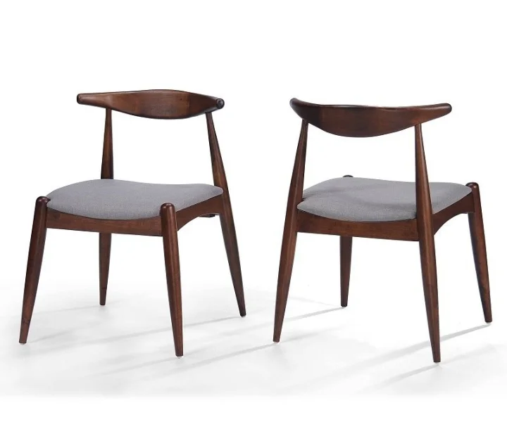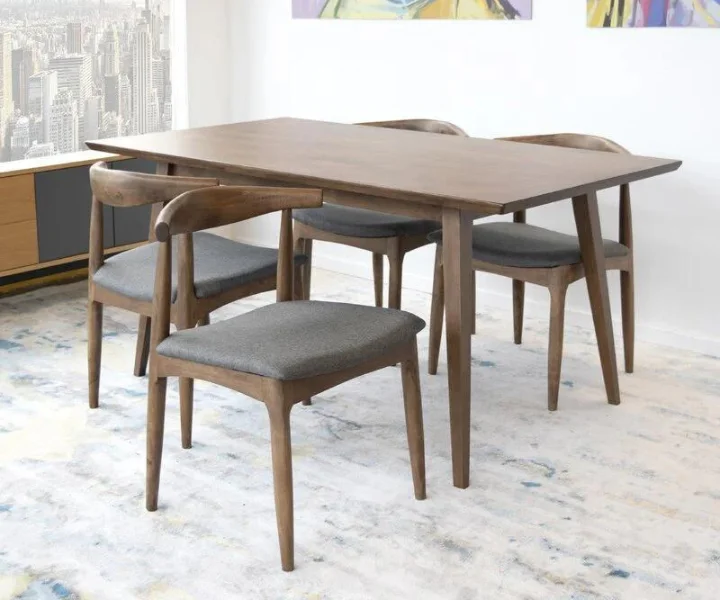 The image shows a four-seater rectangular dining set made of teak wood. The set features a minimalist, mid-century modern design. The table has a clean, smooth surface with tapered legs that give it an elegant and sturdy look. The chairs have a curved backrest with a solid wood frame and cushioned seats upholstered in a dark gray fabric, providing comfort while complementing the wooden texture. The overall design is simple yet stylish, fitting well in a contemporary or modern dining room setting.
