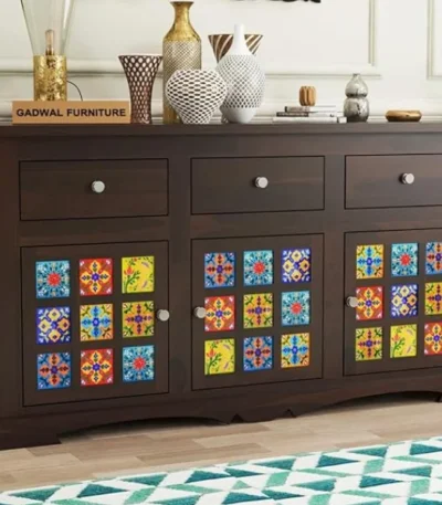 Boho Sheesham Wood Tv Cabinet with Ceramic Tiles & Storage